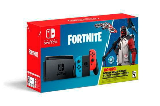 El pack ha sido presentado por la compañía nipona en Estados Unidos, y lleva el nombre Nintendo Switch Fortnite Double Helix Bundle. Se compone de la consola híbrida de la Gran G (pantalla, Dock, Joy-cons azul y rojo, cable HDMI y adaptador de corriente para la consola), descarga completa de Fortnite Battle Royale, 1.000 paVos (la moneda virtual del juego) y el pack Double Helix, que consta una apariencia única, una mochila, un planeador y un pico.